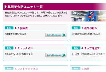 毎月更新される10点の課題(ユニット)は、海外生活などで活用できる実用的なものばかりです。お好みに合わせてお選びいただけます。