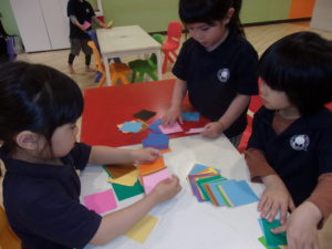 最初はとてもスムーズに折れていましたが、指を中に入れつぶしながら折るところに「難しい…」「せんせーいできない!!」と言う声がちらほら…(笑)苦戦する子がたくさんいましたが最後まで頑張って折っていた子ども達でした!