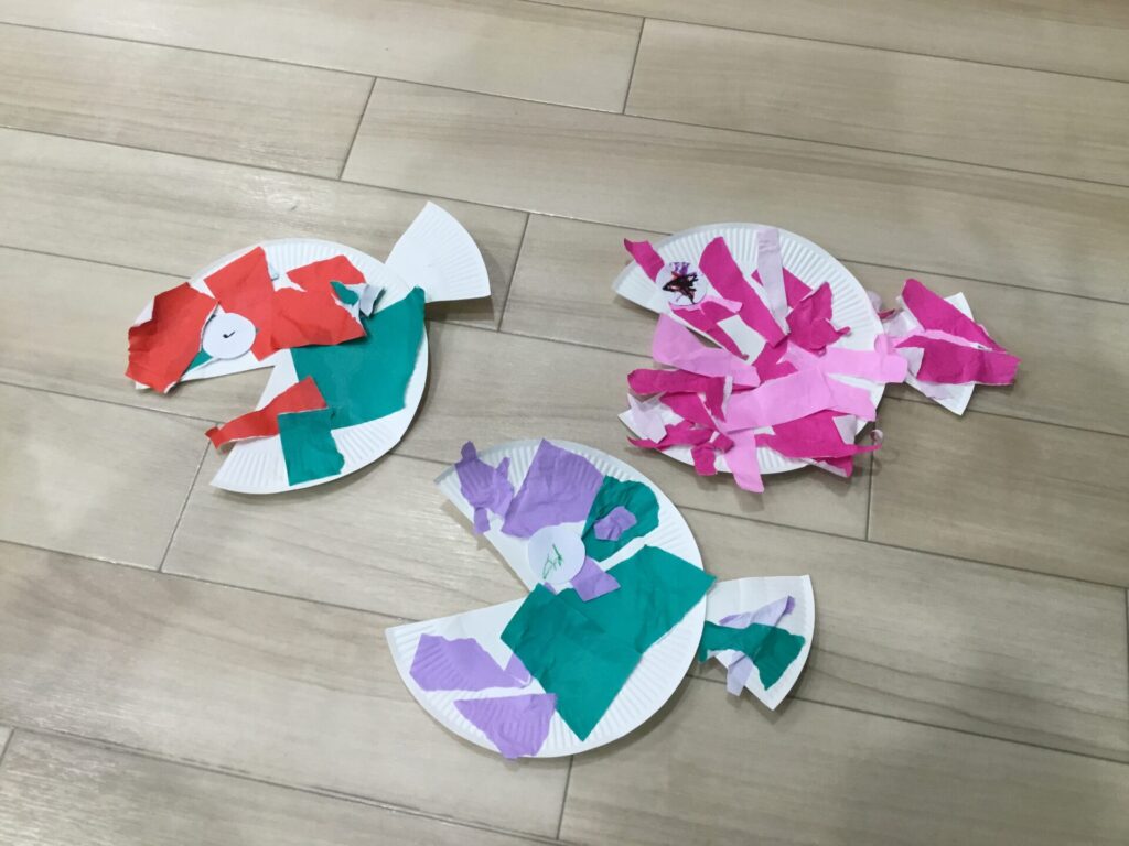 次は・・・さかなの形の紙皿にのりをつけ、ちぎった折り紙をぺたぺたと貼りましたよ✌のりをつける作業も慣れてきた様子です💛