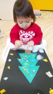 We have created our Christmas artwork. There are several steps to completing it. 1. Having paint on our fingers and putting it on the Christmas tree. These dots will be Christmas ornaments.