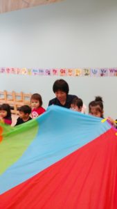 We attended the Prekiner class activity using a parachute. First we hold it low and lift it high before getting under it. It was very exciting!