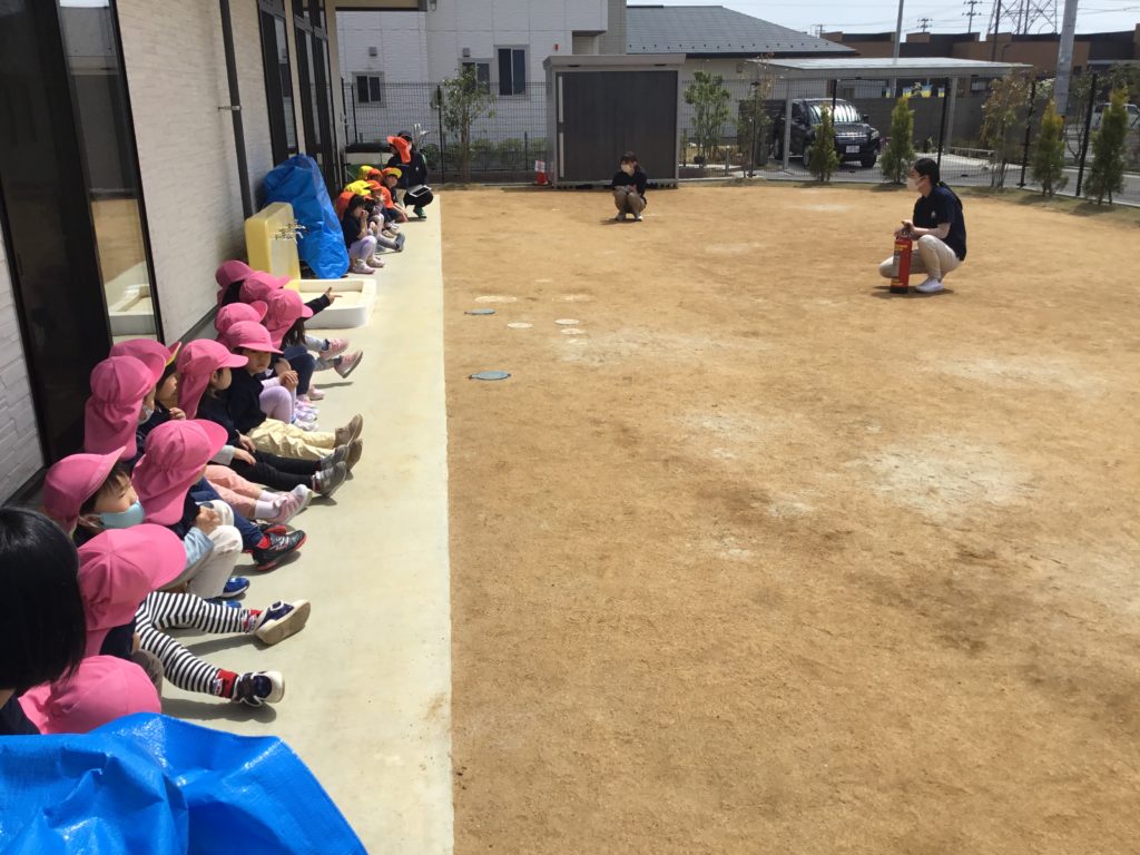 みんなで避難訓練についてお勉強した後は、Kinder2.3さんと一緒にお外に出て消火訓練の様子を見学👀