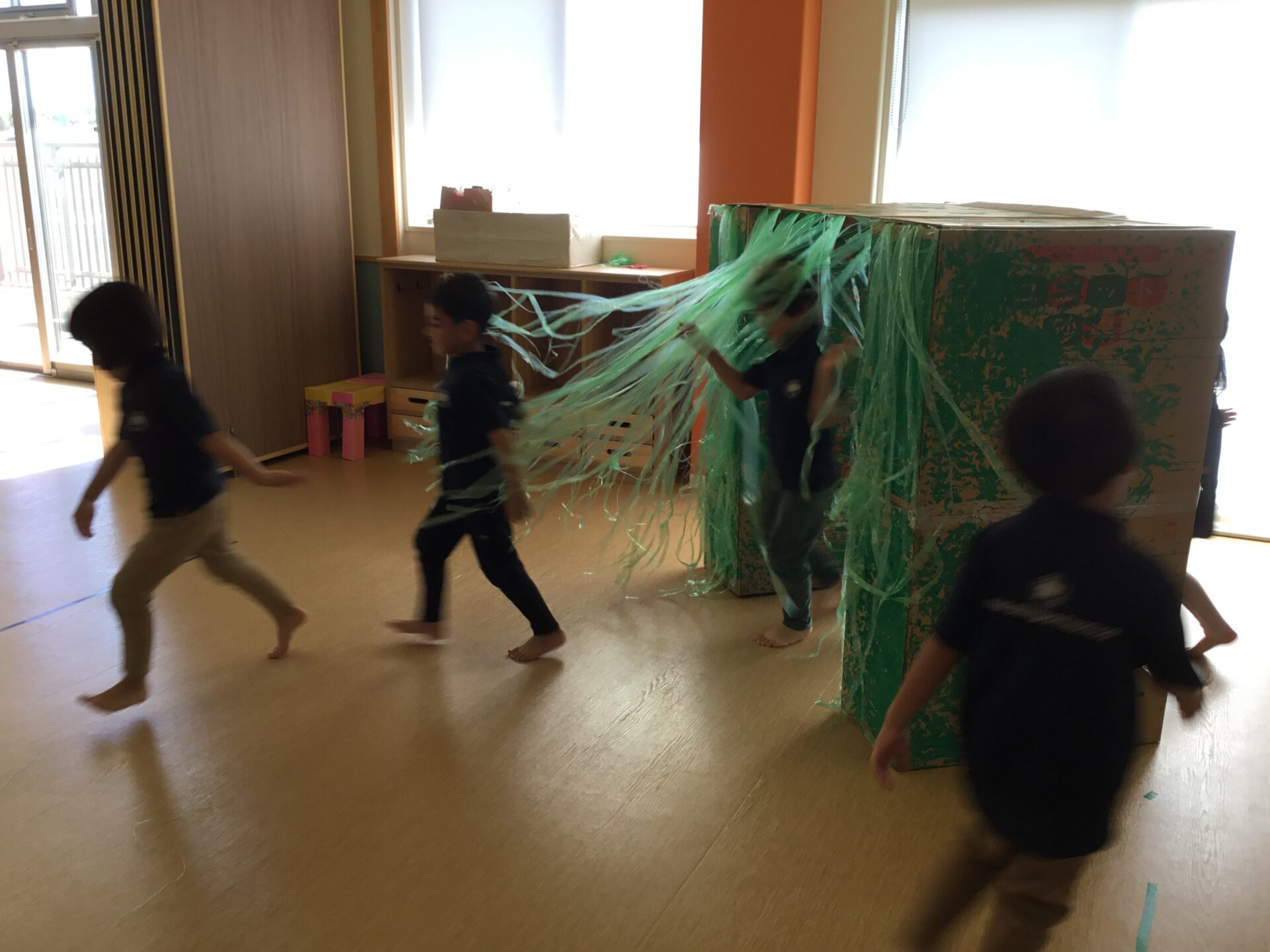 On Wednesday the class finger painted some boxes green together with me, and today we made some tape vines to compete our project. We made a jungle! We had fun making it, and we had more fun playing with it. We are using it for our school festival performance called “bear hunt”. The kids love singing the bear hunt song loudly and with a lot of energy. We are excited to show you the performance in November!