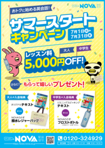 ネイティヴの外国人講師による少人数レッスンが、月4回1万円からの低価格で受けられる英会話教室です!レッスンは全て5段階のレベル別。グループ英会話レッスンでも、同じ進度の生徒様同士だから安心して受講頂けます。自分のペースでじっくり学びたい方には、講師を独占できるマンツーマンレッスンも月4回2万円からございます。日本人スタッフによる万全のサポートシステムで、質問もしやすく初心者の方も安心してご受講いただけます。NOVA監修のオリジナル教材は、ビジネス・旅行・留学向けや、英検®・TOEIC®対策など、目的・目標にあわせて学習が可能。PC・スマートフォン・タブレットなどでもご利用いただけるデジタル式のテキストもあります。オンライン英会話も高品質。簡単予約で時間や場所を選ばずレッスン開始!スキマ時間に英語力をアップしたい方に最適です。まずは無料体験を!お気軽にご相談ください。