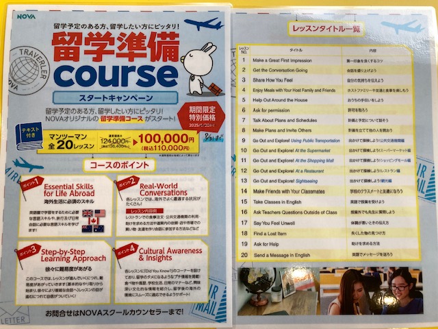 NOVAでは追加費用ゼロで、英語に加え、フランス語・ドイツ語・イタリア語・スペイン語・中国語・韓国語の計7言語が選べます。