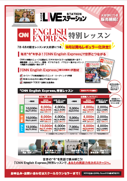 NOVAでは追加費用ゼロで、英語に加え、フランス語・ドイツ語・イタリア語・スペイン語・中国語・韓国語の計7言語が選べます。