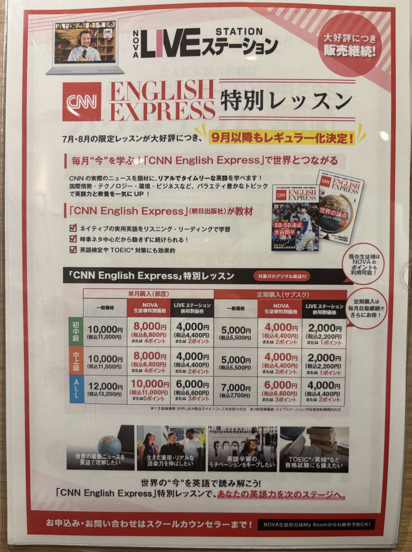 ネイティヴの外国人講師による少人数レッスンが、月4回1万円からの低価格で受けられる英会話教室です!レッスンは全て5段階のレベル別。グループ英会話レッスンでも、同じ進度の生徒様同士だから安心して受講頂けます。自分のペースでじっくり学びたい方には、講師を独占できるマンツーマンレッスンも月4回2万円からございます。日本人スタッフによる万全のサポートシステムで、質問もしやすく初心者の方も安心してご受講いただけます。NOVA監修のオリジナル教材は、ビジネス・旅行・留学向けや、英検®・TOEIC®対策など、目的・目標にあわせて学習が可能。PC・スマートフォン・タブレットなどでもご利用いただけるデジタル式のテキストもあります。オンライン英会話も高品質。簡単予約で時間や場所を選ばずレッスン開始!スキマ時間に英語力をアップしたい方に最適です。まずは無料体験を!お気軽にご相談ください。