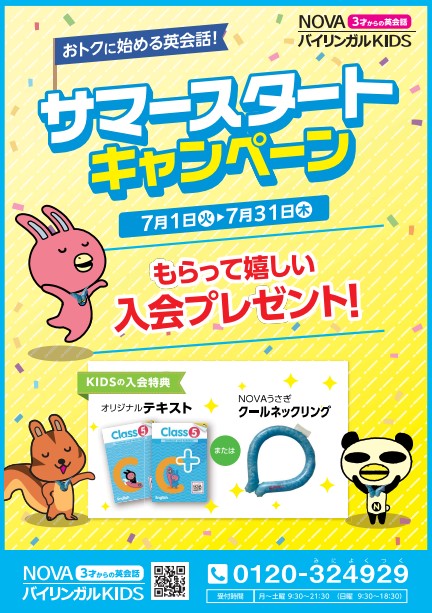 3歳からのこども英会話「NOVAバイリンガルKIDS」も開講。もちろんこどもも講師は全員外国人。レッスンは年齢別ではなく「上達」にあわせたレベル別。「英語で考えて話す」力が身につくレッスンです。3才のお子様から学生、社会人、シニアの方まで幅広い世代の方が、英会話力を身につけたい!とお通い頂いており、活気あふれるアットホームな校舎です。いっぱい聞けて、いっぱい話せるNOVA。上達に向けて英会話レッスンをNOVAでスタートしませんか?まずは無料体験・資料請求を!お気軽にご相談ください。
